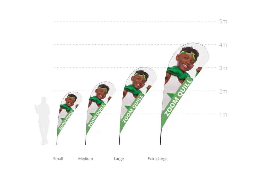Puoi scegliere forma e dimensione della tua bandiera espositiva personalizzata per adattarla al meglio al contesto: ogni singolo modello può essere realizzato in 4 diverse misure con altezza totale da 2 a 5 metri.
