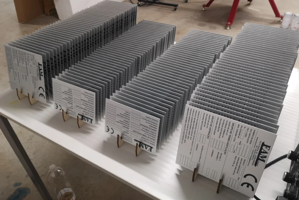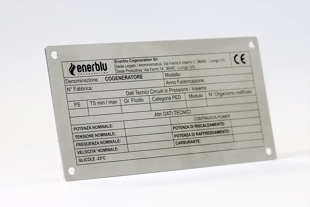 Terminato il processo di stampa, le targhe CE vengono incise con laser a fibra o punzonate in serie, riportando i dati identificativi necessari per poter procedere poi all'applicazione sul macchinario.