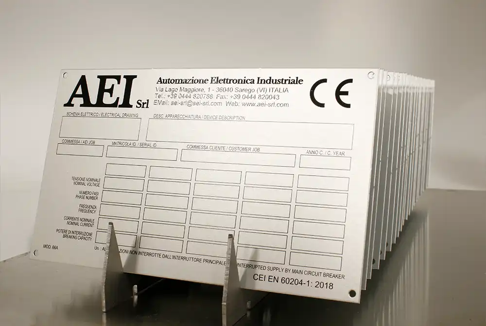 Siamo in grado di produrre e personalizzare targhe CE per macchinari industriali in ogni formato, anche su disegno, fornendo un prodotto finito di alta qualità e durevole nel tempo.